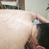 前頚部・背中・首肩と全身にアプローチしました。施術中には鍼を刺した状態で肩を動かしてもらう「運動鍼」も行い、固まった肩甲骨周りの筋肉を効果的にほぐしていきました。